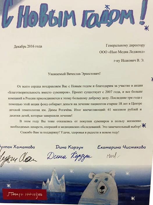 Надо сказать, довольно многие компании стараются использовать этот повод для благотворительности. Так, уже не первый год компании Media Broadcasting Group Limited и New Media Legend на новый год весь сувенирный бюджет на новогодние подарки направляют на благотворительность в фонд "Подари жизнь".