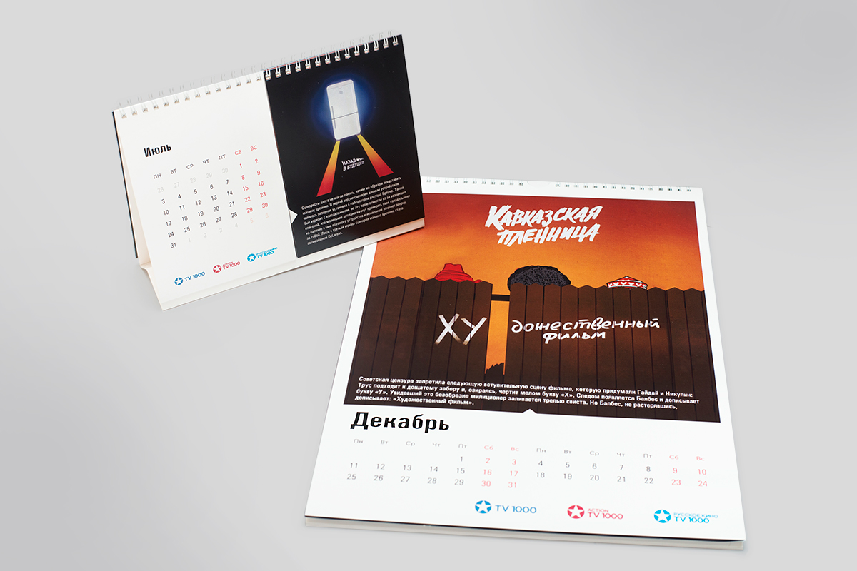 Во-первых, мы сделали объемные ежедневники и два вида календарей, основанных на дизайнерских работах с использованием малоизвестных фактов о том, как снимались советские, российские и голливудские фильмы такие как: "Звездные воины", "Левиафан", "Любовь и голуби", "Терминатор", "Назад в будущее", "Легенда 17" и др.