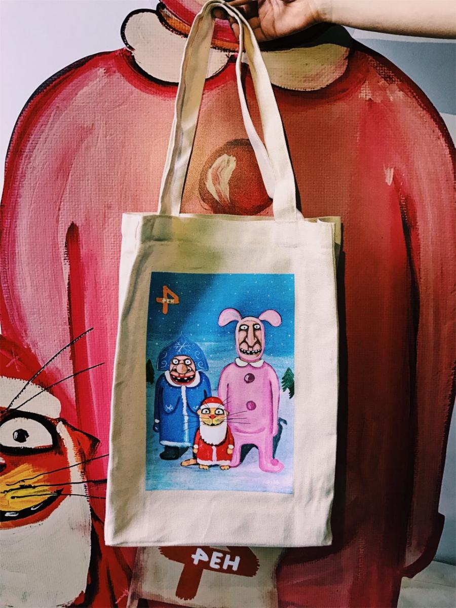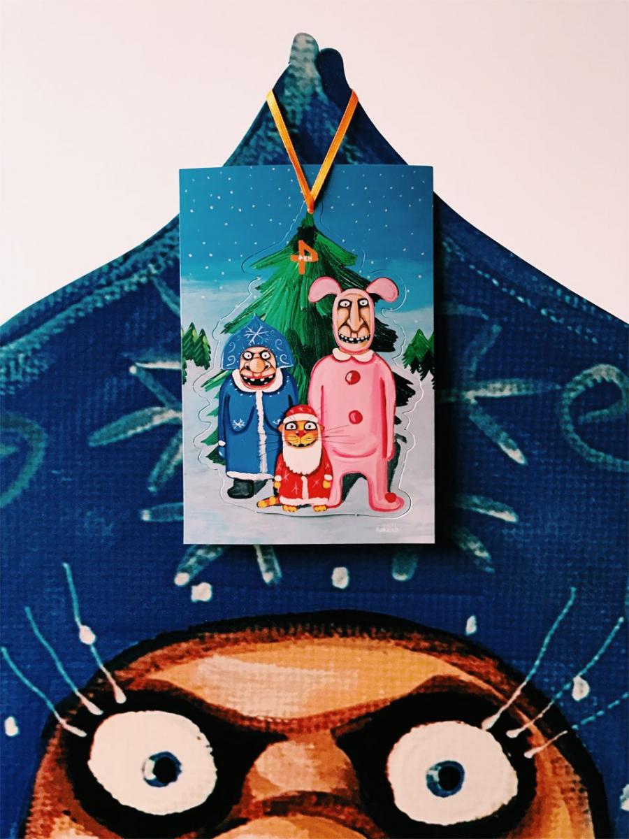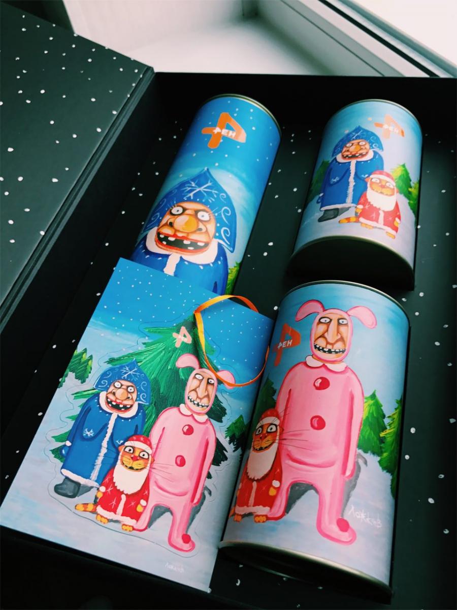 Также в этом году мы решили добавить празднику немного юмора. Здесь как нельзя кстати пришлось творчество популярного в Сети художника Васи Ложкина. Его самые узнаваемые персонажи примерили на себя новогодние костюмы и оказались на подарках от РЕН ТВ. Специально для РЕН ТВ Василий написал картину, которая и легла в основу праздничного имиджа".