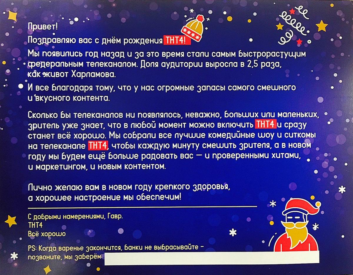 Директор канала Гавриил Гордеев: "Главная идея – мы дарим то, что проверено годами, никогда не надоест и гарантированно обеспечит хорошим настроением, как и канал ТНТ4. Вместе с вареньем в подарке была открытка с моим номером телефона, которую я сам подписал каждому партнеру. Еще один отличный способ пообщаться и поздравить человека лично".