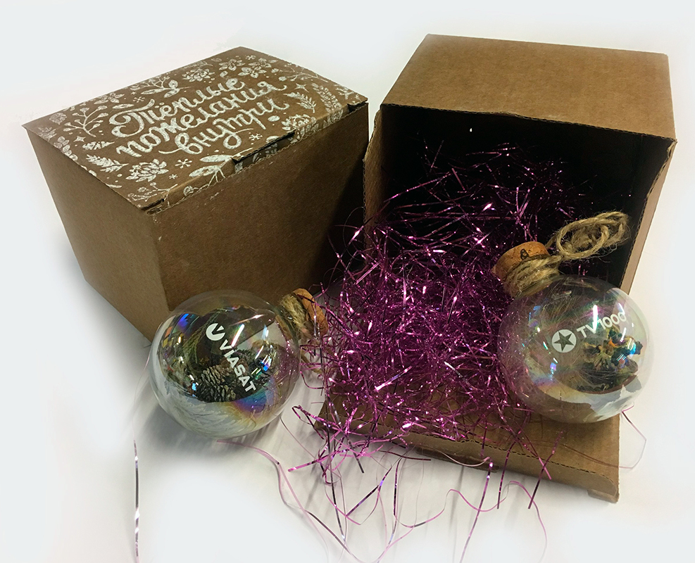Во-вторых, мы сделали новогодние елочные шары, которые внутри наполнены настоящими шишками и сухоцветами. Тема с елочными игрушками уже не новая, но таких точно еще никто не делал.