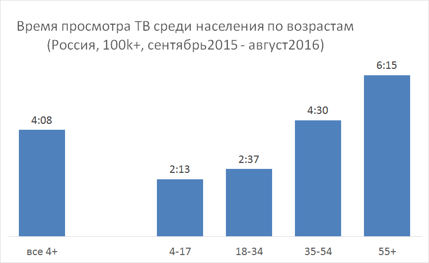 Среднесуточное время просмотра ТВ с сентября 2015 по август 2016 составило 4 часа 8 минут, что на 4 минуты больше, чем в прошлом сезоне.