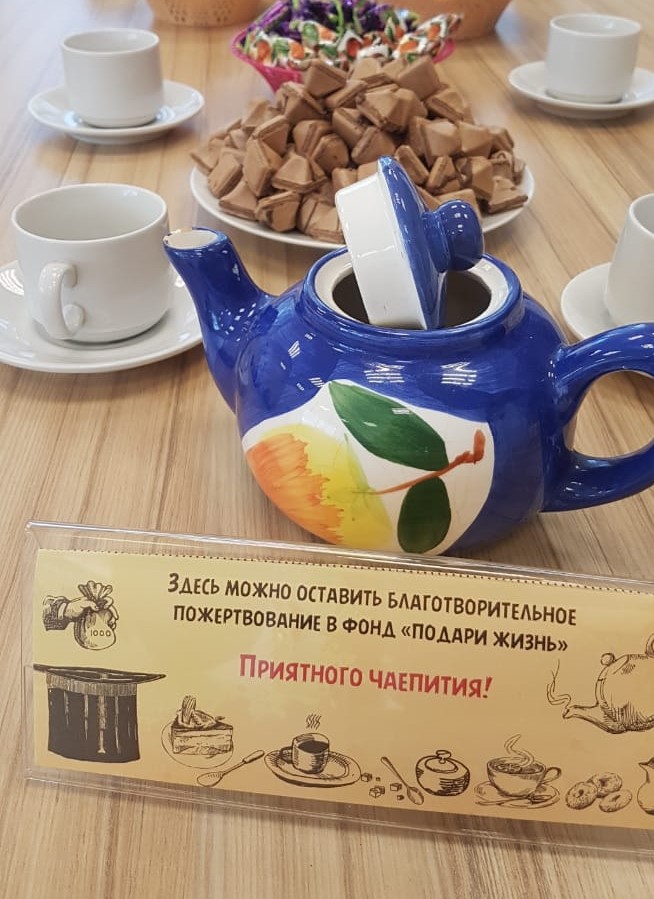 В день X Лена принесла в офис баулы с бабушкиным сервизом, антикварными чайниками и скатертью. Коллеги помогли с закупкой сладостей. Все в офисе старались по максимуму принять участие в организации нашего первого мероприятия. Поначалу люди настороженно отнеслись ко всему происходящему, но потом втягивались, грелись чаем, на лицах появлялись улыбки, многие фотографировались. Все проходило в невероятно теплой атмосфере. В результате мы собрали приличную сумму, а также контакты благотворителей, желающих включиться в дальнейшую помощь. Так мы стали друзьями фонда "Подари жизнь".