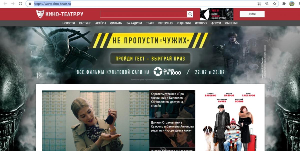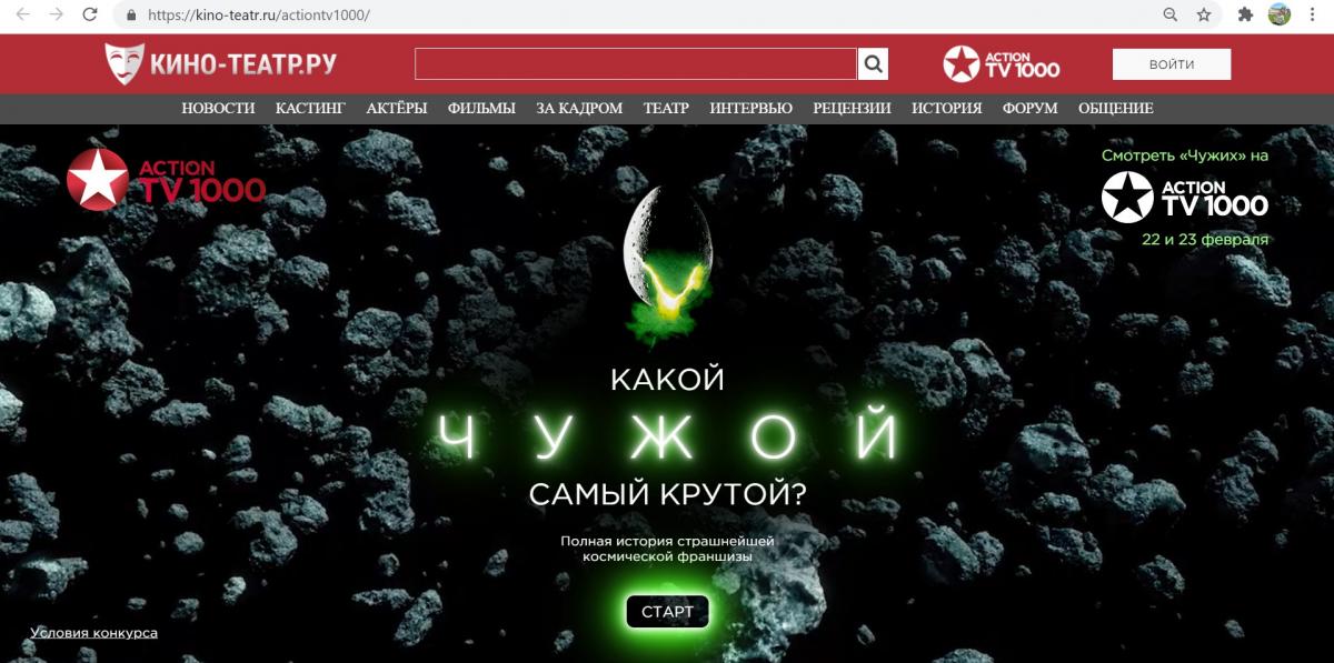 Параллельно в течение месяца до выхода на канале "Чужих" кипела работа по подготовке креативного спец. проекта на портале Кино-Театр.Ру – теста от телеканала TV1000 Action. Викторина с "кратким курсом" по истории франшизы проводилась на отдельном лендинге, проект анонсировался на сайте при помощи брендирования, сквозного баннера, кнопки в шапке сайта и баннера в поисковой выдаче портала. Кино-Театр.ру также анонсировали проект в обширной сети партнёров и дружественных информационных каналов в Telegram.