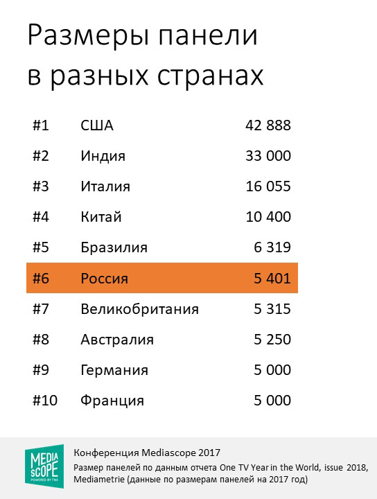 К. Ачкасова: Самая большая панель, на самом деле, в Индии – там порядка 22 тысяч домохозяйств. Когда я общалась с представителями индийских измерителей, спросила: "Я все понимаю, но не понимаю, где вы деньги берете на все это?". Мне ответили: "Наша индустрия очень хочет, поэтому мы это сделали".