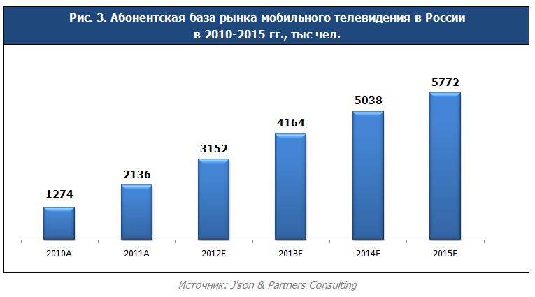 Аналитики J'son & Partners отмечают, что к концу 2011 году у трех ведущих игроков мобильного рынка — МТС, "МегаФон" и "ВымпелКом" уже имелись собственные сервисы мобильного ТВ. Кто-то из них развивался более успешно, кто-то — менее. Например, у МТС база абонентов данной услуги по состоянию на март 2014 года насчитывала 1 млн человек. Таким образом база МТС составляет треть от всей базы мобильного ТВ в России, которая по оценкам аналитического агентства в настоящий момент достигает 3 млн абонентов, а к 2016 году должна вырасти до 6 млн подписчиков.