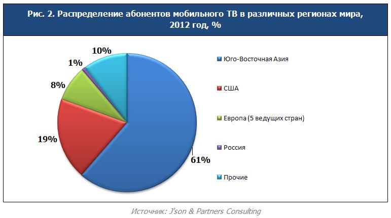 Аналитики компании J'Son & Partners Consulting поделились результатами своего масштабного исследования рынка мобильного ТВ. По их оценкам, уже к концу 2014 года в мире будет насчитываться порядка 800 млн подписчиков данной услуги против 271 млн в 2011 году. При этом наибольшее число абонентов будет приходиться на Юго-Восточную Азию (61%), США (19%) и Западную Европу (около 8%). России же к указанному периоду будут принадлежать 1% от общемировой базы мобильного ТВ.