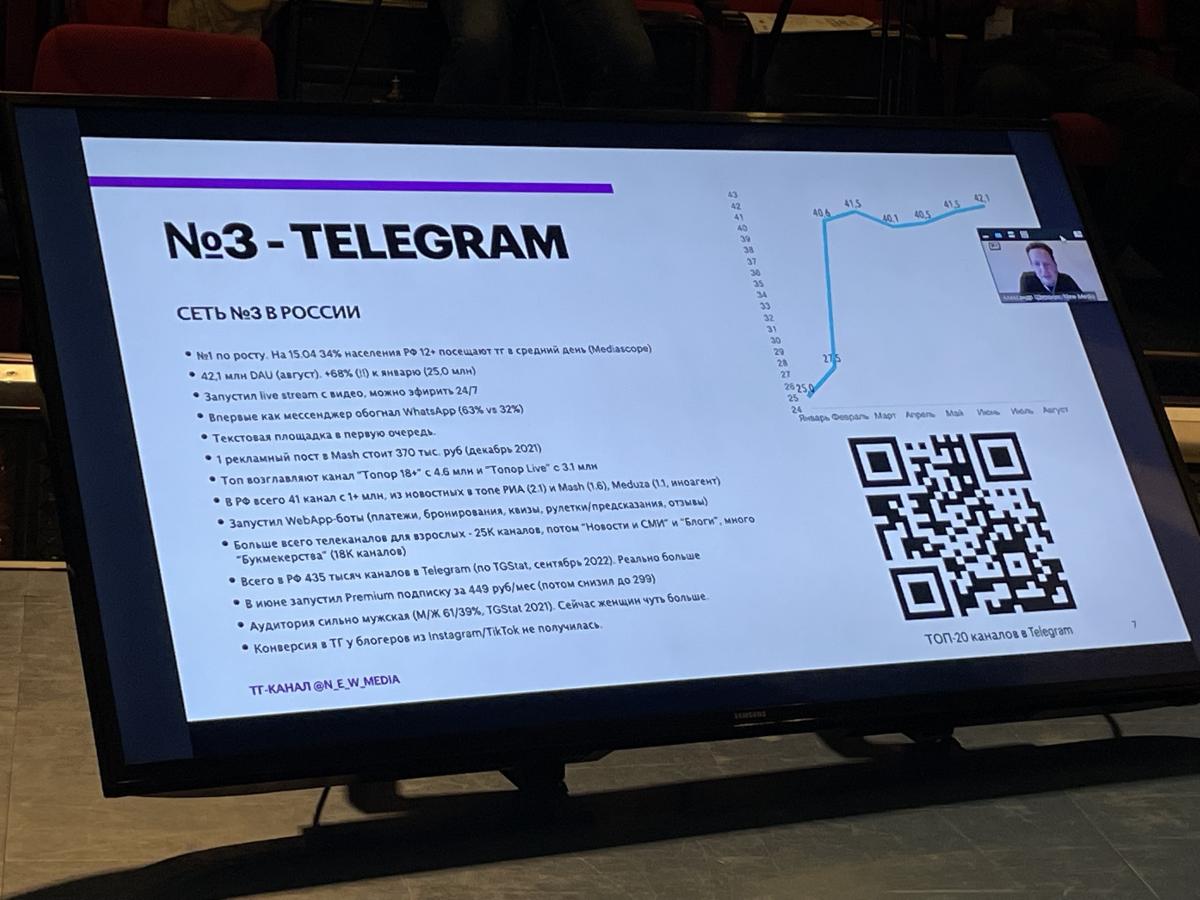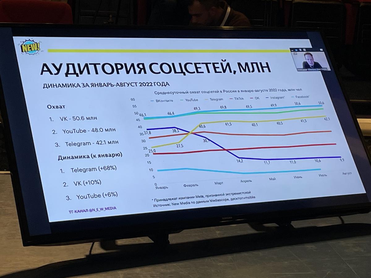 Вслед за данными потребления контента на MUSE 2022 представили информацию по потреблению соцсетей. С соответствующим докладом выступил генеральный директор НАТ Александр Широких. Он собрал разные тренды и цифры в потреблении соцсетей за период с января по август 2022 года. Отметим, что речь не идет о данных за весь период — Александр представлял цифры как по отдельным месяцам, так и за определенный срок.