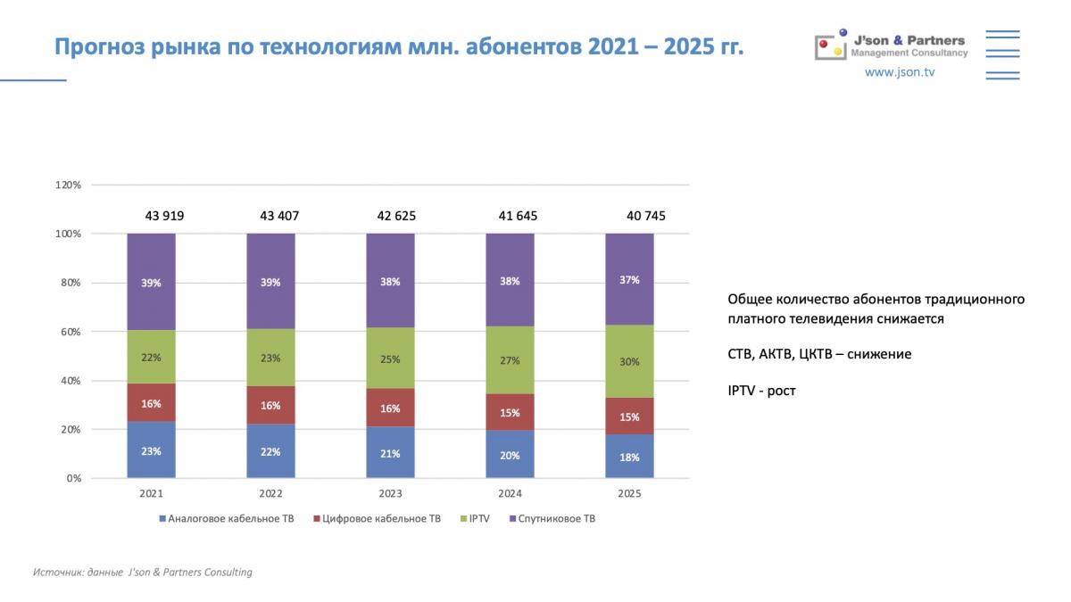 По прогнозам аналитиков, к 2025 году объем традиционного рынка платного ТВ снизится до 40,7 млн домохозяйств. В абонентах потеряют все секторы, кроме IPTV, который нарастит свою долю с текущих 22% до 30%.