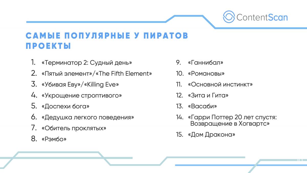 Так вот, с момента начала спецоперации, чаще всего пользователи обращались к нелегальному просмотру фильмов "Терминатор 2: судный день", "Пятый элемент", "Укрощение строптивого" и "Доспехи бога" и сериалу "Убивая Еву". Как мы видим — премьерного контента в топ-5 нет совсем, хотя в топ-15, например, "засветился" сериал "Дом Дракона" — приквел нашумевшей "Игры Престолов".