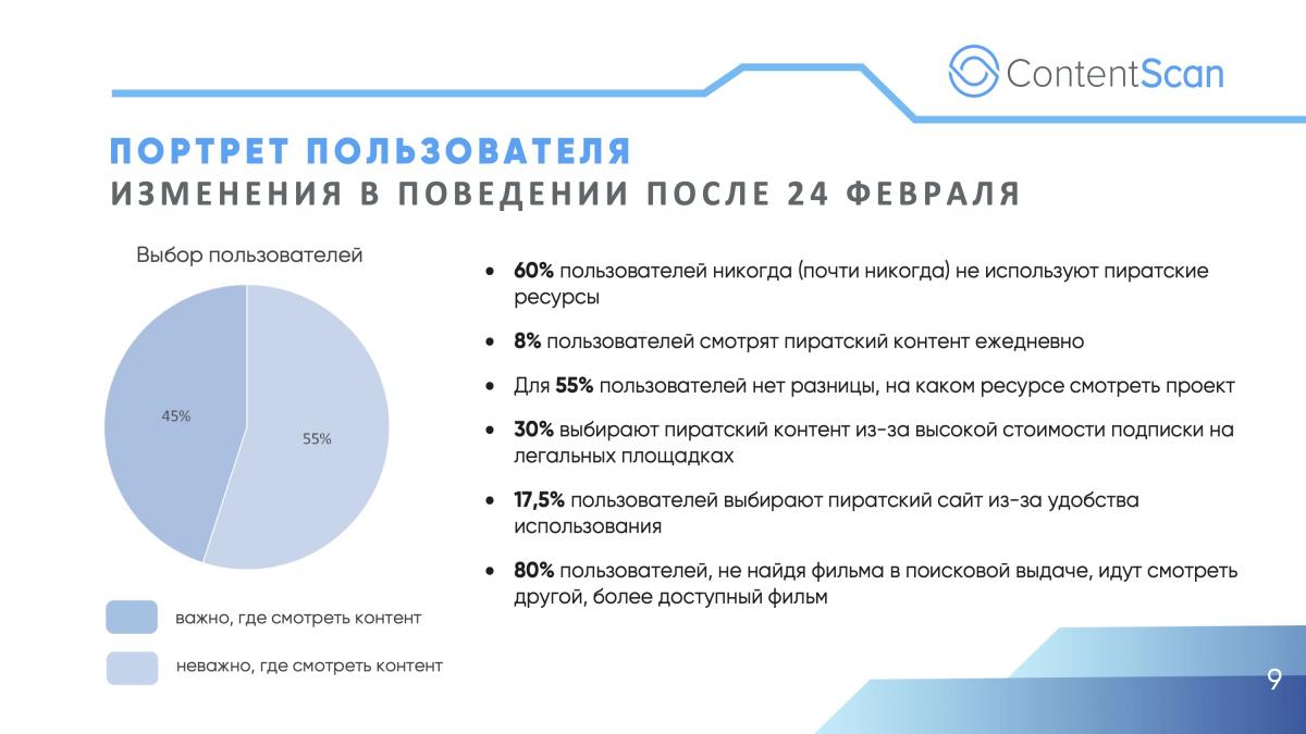 Коль скоро мы затронули тему ухода крупных зарубежных игроков, то остановимся кратко еще и на данных компании ContentScan, занимающейся защитой контента в интернете. Сразу оговоримся, что их аналитика основана на собственной практике, так что приводимые ниже примеры показательны не в разрезе всего рынка, а исключительно в рамках библиотеки тех клиентов, чей контент входит в сферу их защиты (а это ВГТРК, КиноПоиск, "Вольга", Bazelevs, Amediateka, "Марс Медиа" и прочие).