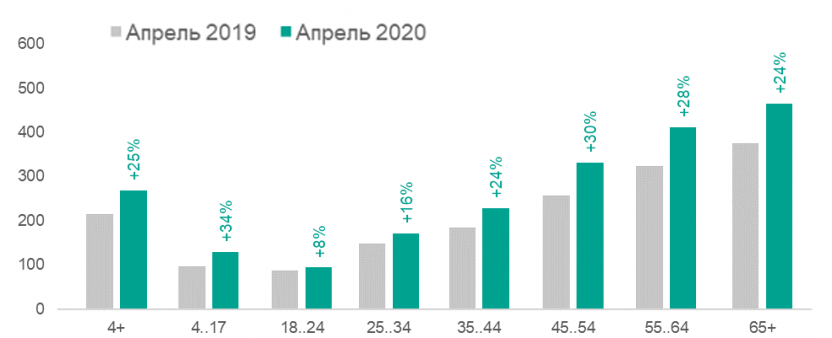 - В апреле 2020 жители российских городов с населением более 100 тыс. человек старше 4 лет смотрели ТВ на четверть больше времени, чем в апреле прошлого года — в среднем 269 минут каждый день. Время телепросмотра также выросло по сравнению с мартом 2020 на 13%.