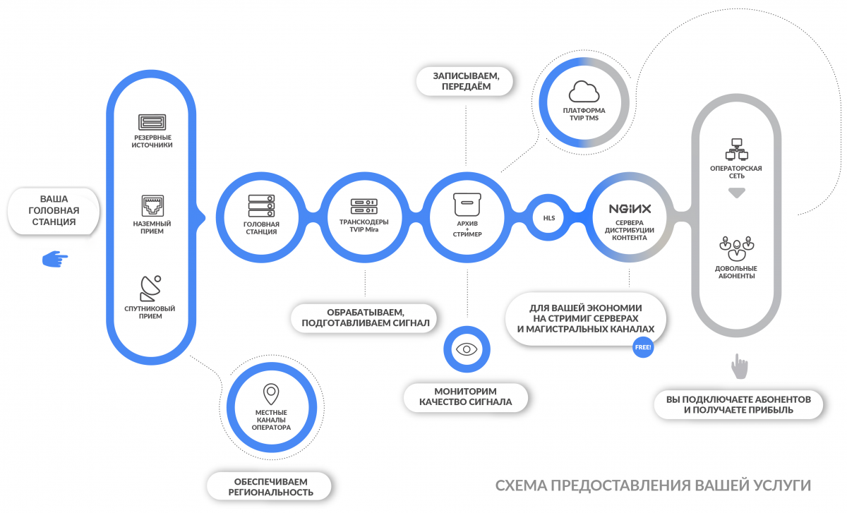 Компания TVIP предлагает запуск полноценной IPTV/OTT услуги для операторов любого уровня. TVIP предоставляет оператору решение любой сложности в зависимости от его задач и бюджета.