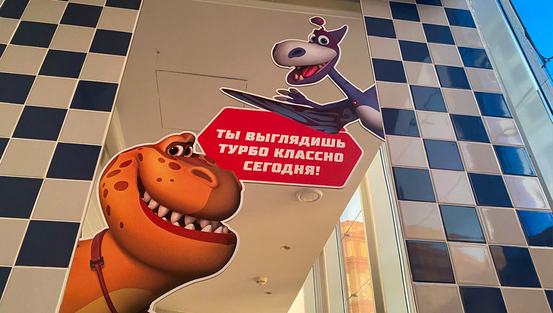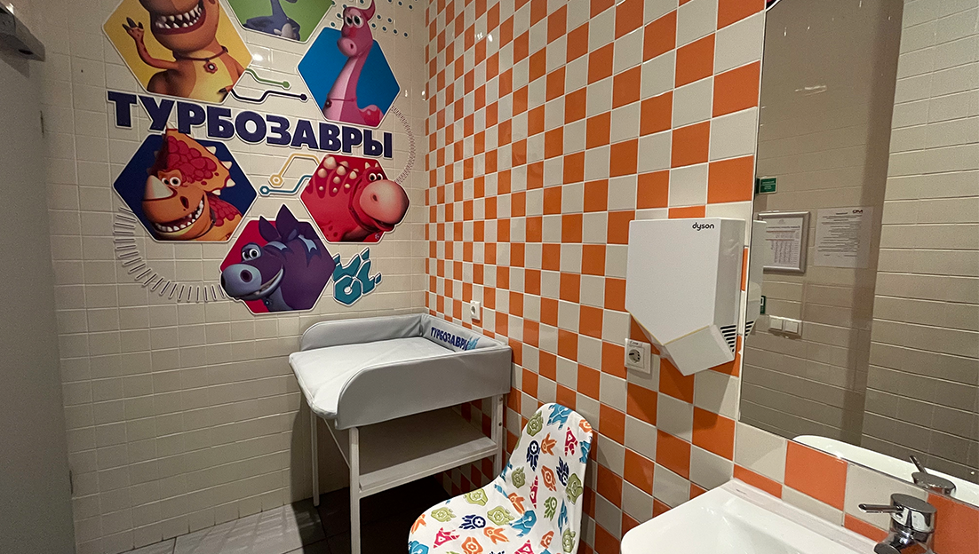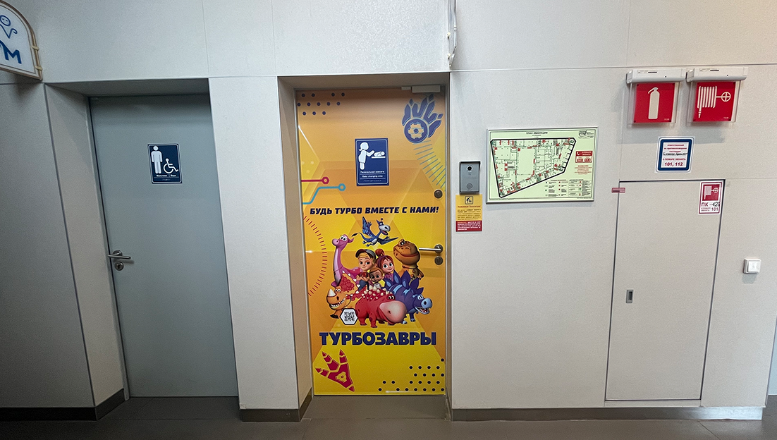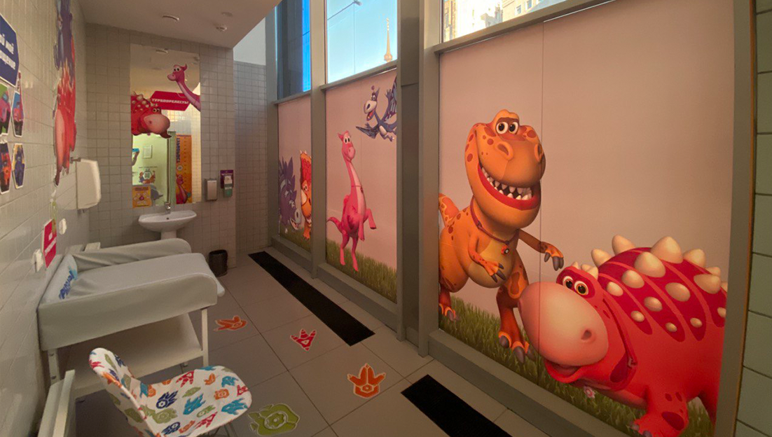 Мы использовали не совсем стандартный формат: разместили креативный брендинг с “Турбозаврами” в комнатах мамы и ребенка в ЦДМ на Лубянке. На стенах появились яркие изображения добрых и приветливых персонажей мультсериала, на зеркалах — забавные рамочки с мотивирующим текстом, а около двери - линейка, чтобы в любой момент можно было узнать, какого роста ваш ребенок. Такое решение было связано с множеством факторов. Во-первых, это место, где наша ЦА, мамы с детьми, проводят объективно много времени. Обычно процедура переодевания достаточно стрессовая, а яркие картинки позволяют отвлечь малыша и сделать процесс проще и веселее. Во-вторых, помимо контакта с мамами, которые чаще всего принимают решения, какой контент включить ребенку, мы могли также взаимодействовать и с прямым зрителем — старшими братьями и сестрами младенцев. Не секрет, что им часто бывает скучно, пока мама или папа переодевают младшего братика — в это время они могли развлечь себя, рассматривая картинки с любимыми персонажами. И наконец: такие помещения практически никогда не используют для размещения маркетинговых материалов, поэтому они производят впечатление и позволяют сразу выстроить эмоциональный контакт.