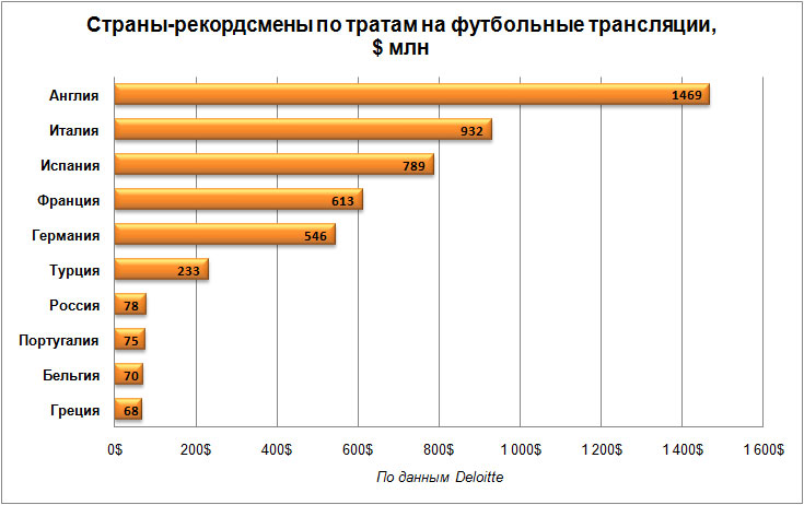 По прогнозам Deloitte Technology, Media & Telecommunications (TMT), в наступившем году глобальный объем премиальных вещательных прав на спортивные трансляции вырастет до $24,2 млрд, то есть на 14% или $2,9 млрд по сравнению с 2013 годом. Данный рост будет обеспечен новыми соглашениями с топовыми Европейскими футбольными лигами и главными спорт-лигами Северной Америки.