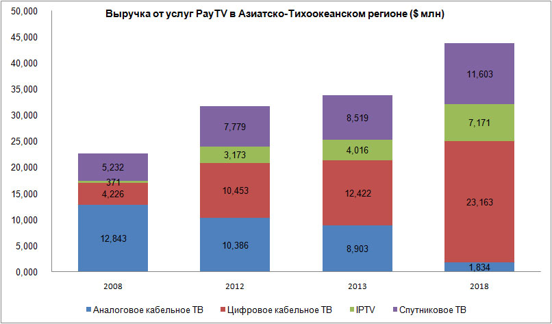 По подсчетам исследовательского агентства Digital TV Research, выручка от услуг платного телевидения в Азиатско-Тихоокеанском регионе в 2013 году выросла на $2,1 млрд — до $33,9 млрд. Во многом благодаря стремительному развитию здесь спутникового ТВ и не менее стремительной "цифровизации" региона.