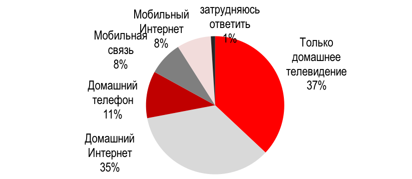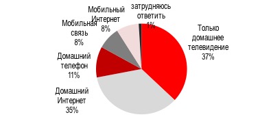 Технология IPTV расположена на третьем месте по популярности, но стоит отметить, что 15% респондентов не имеют представления об используемой технологии. В Москве очень распространенным является подключение нескольких услуг. Около 62% респондентов помимо телевидения подключены к пакету услуг оператора. Самой распространенной дополнительной услугой оказался домашний интернет — 35%, на втором месте стоит домашний телефон — 11%.