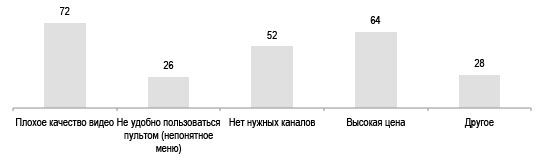 15% респондентов, которых не устраивает выбранный оператор, отметили плохое качество видео, неудобство использования, отсутствие нужных каналов, высокую цену, а также периодическую потерю сигнала, плохой звук, проблемы со скоростью и сбой работы домашнего интернета (при подключении пакета услуг). Было также выражено недовольство по контентной политике телеканалов, указывались такие ответы как "заезженный репертуар", "нечего смотреть", "много рекламы" и т.п.