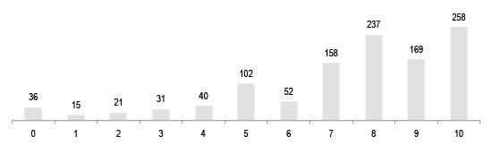 Из полученных оценок можно сделать вывод, разделив всех потребителей на три группы, что только 427 респондентов (38%) являются сторонниками данного провайдера и готовы его порекомендовать, 395 респондентов (35%) — нейтральные потребители и оставшиеся 297 респондентов (27%) — критики.