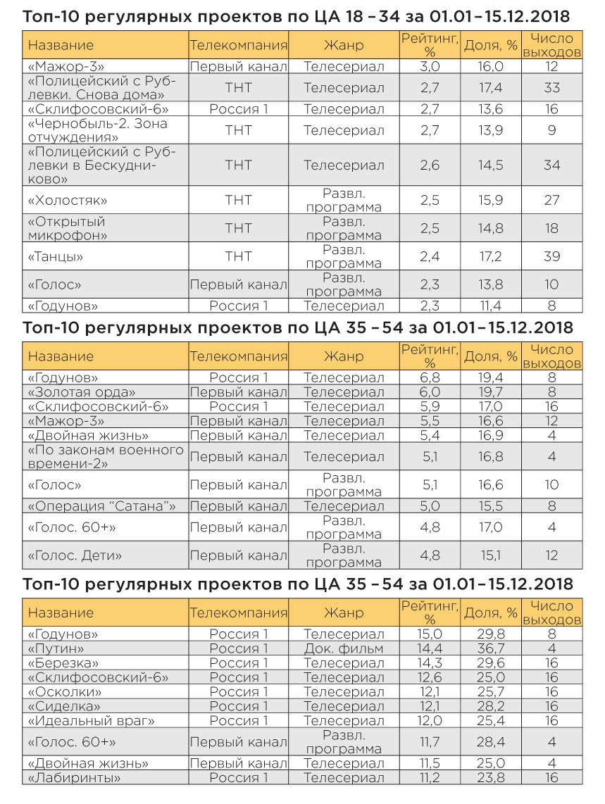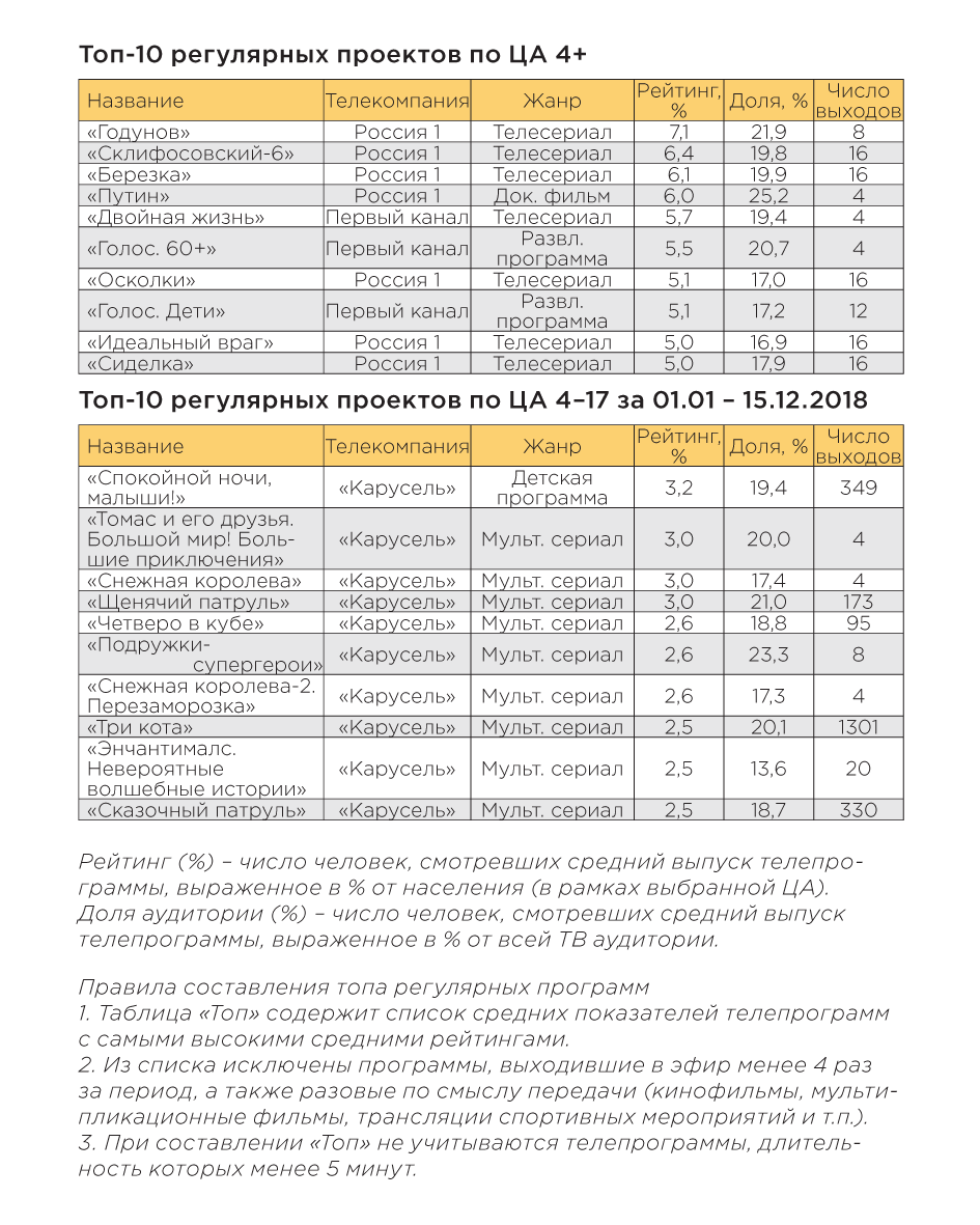 Основу топ-10 регулярных телепроектов как среди всей телеаудитории 4+, так и в разных возрастных группах составляют сериалы. Развлекательные программы в десятке самых рейтинговых телепроектов заметнее всего представлены среди более молодой аудитории: 18–34 и 35–54 лет.