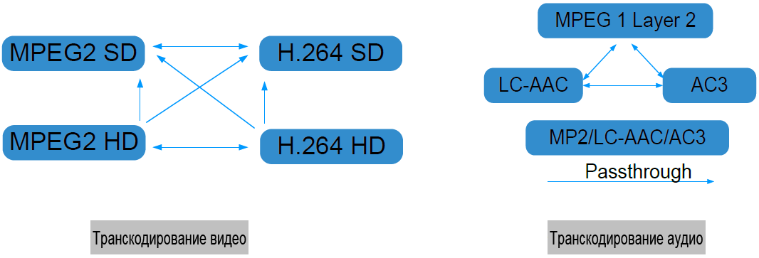 Устройство успешно оптимизирует видео-полосу, что позволяет соответствовать требованиям операторов цифрового ТВ. В процессе работы транскодером обеспечивается преобразование HD качества в SD; само количество программ видео-транскординга: 8 для SD или 4 для HD. Транскодированные выходные потоки MPTS и SPTS могут поступать на DATA/IP порт или ASI порт.