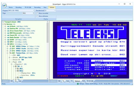 Телетекст цифрового формата - это более новый инструмент цифрового транспортного потока, его работа осуществляется благодаря программному обеспечению StreamXpert (генераторы PSI и SI, идентификаторы, цифровые данные и т.д.). Программным обеспечением StreamXpert предоставляется возможность расшифровки телетекста и его информационного перечня. Благодаря StreamXpert становится доступным чтение и распознавание сведений цифрового телетекста (Digital Video Broadcasting). Осуществляются проверки страниц - это необходимо для того, чтобы убедиться в правильности передачи и расшифровки данных на страницах телетекста в анализируемом цифровом потоке. Декодером цифрового телетекста обеспечивается расшифровка расширенного телетекста в пределах допустимых уровней.