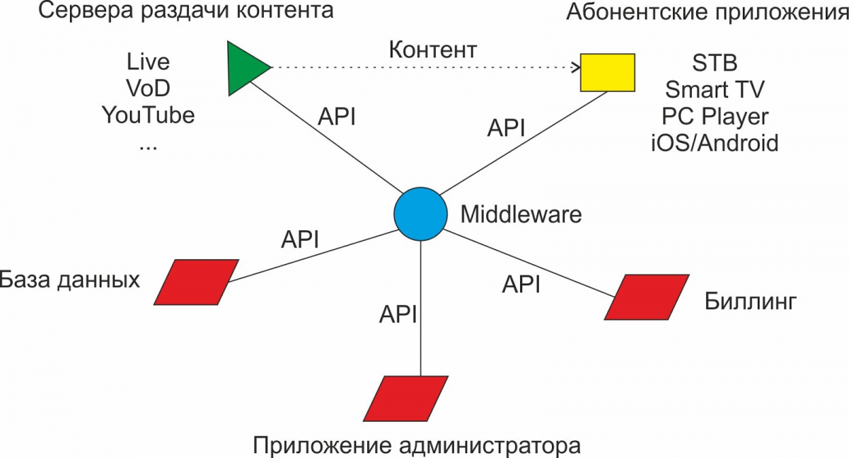 Прежде чем обсудить несколько схем ОТТ решений, вспомним ещё один термин: Middleware IPTV. Так называемый Middleware относится к классу промежуточного программного обеспечения. Глядя на иллюстрацию ниже, становится понятно, почему.