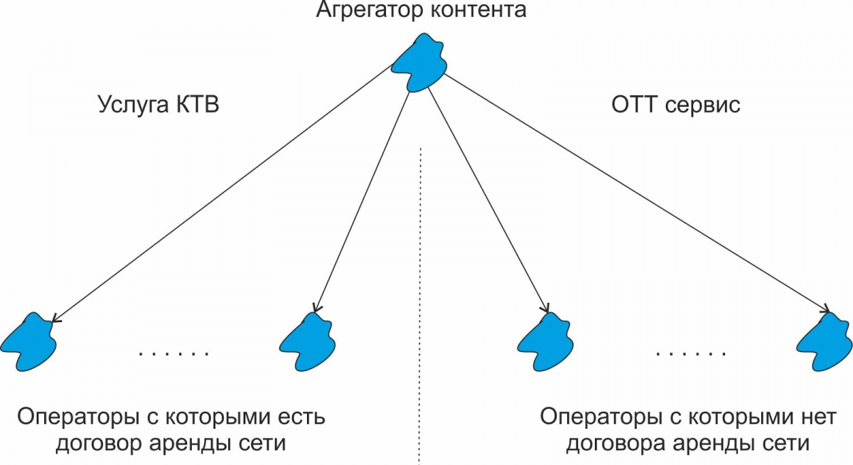 ОТТ-сервис от услуг кабельного телевидения может также отличать наличие или отсутствие прямых договорных отношений. Обратите внимание на особенности работы контент-агрегаторов. Агрегатор в официальной терминологии – это тот же оператор связи, как и его клиенты-провайдеры. У агрегатора имеется лицензия на кабельное вещание и лицензионные договоры с телеканалами. Нет одного: собственной абонентской сети, поэтому он её арендует у операторов связи, с которыми работает (привет Антону Богатову!). Наличие договора аренды показывает, что агрегатор работает в правовом поле телевещания и оказывает кабельную услугу. Стоит расторгнуть договор аренды сети, продолжая предоставлять доступ к телевизионному контенту – процесс превращается в ОТТ сервис.