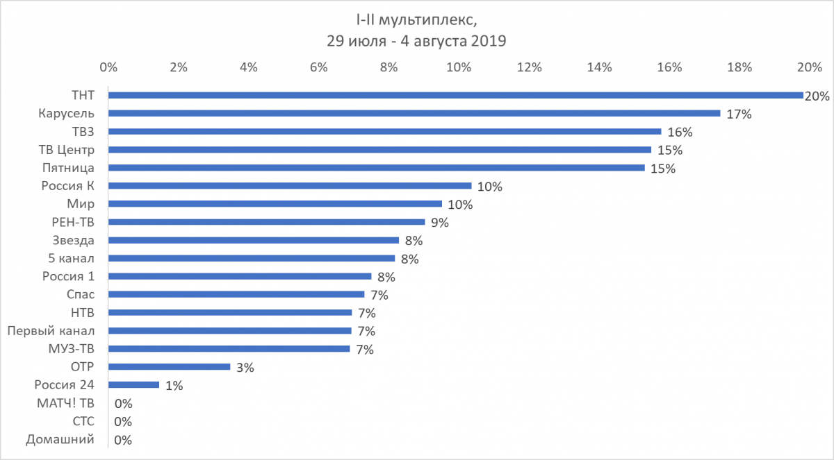 Телеканалы I и II мультиплексов (доля продолжительности отложенного просмотра к общей продолжительности телесмотрения)