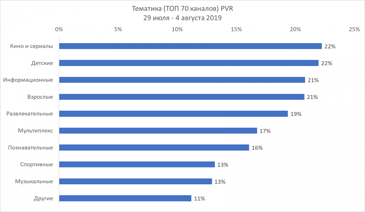 Средняя доля отложенного просмотра среди телеканалов из ТОП 70 в разрезе тематик