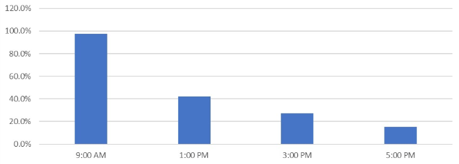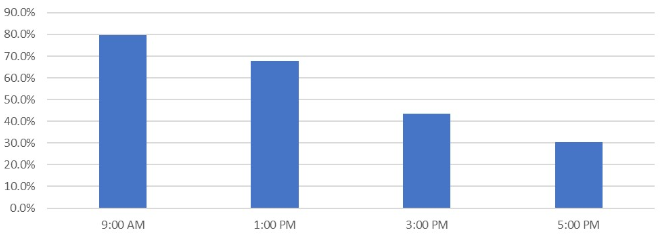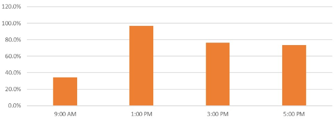 В День 1 общий объем сетевого трафика увеличился от 30% (в 17.00) до 80% (в 21.00). При этом на протяжении всего дня наблюдались пики трафика от 50% до 70%.