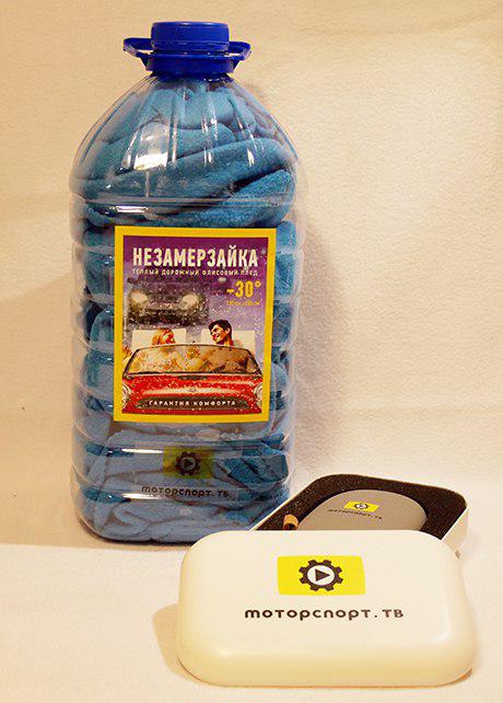 "Моторспорт" знает, что нужно водителям – незамерзайка (в буквальном смысле – плед упакован в бутыль!) и пауэрбанк. Хотя, честно говоря, у нас есть некоторые сомнения насчет стойкости этой "незамерзайки" в заявленные -30...