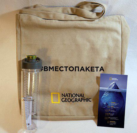 National Geographic Channel решил поднять важную проблему загрязнения бытовым пластиком и запустила акцию #вместопакета. Тематика подарка - продукция многоразового использования: холщовый пакет, многоразовая питьевая бутылка с фильтром и открытка со страшной статистикой загрязнения мира пластиком.