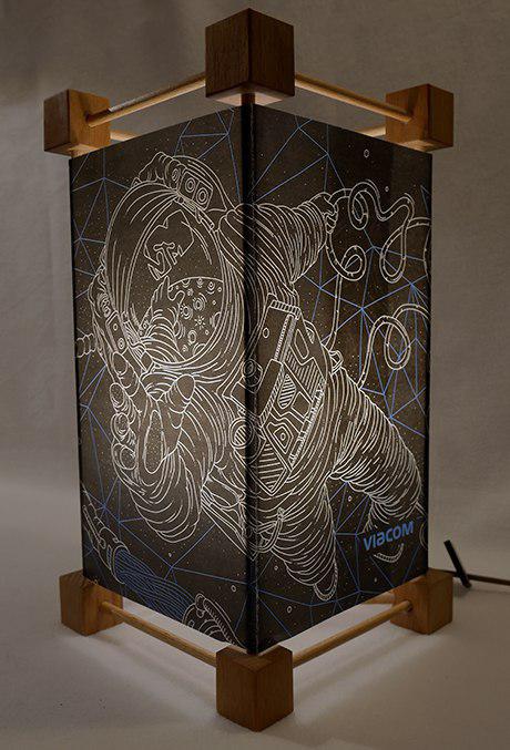 Viacom обратились к благотворительной сувенирке, о которой мы рассказывали в одной из статей, и к заказу продукции в благотворительной мастерской. Лампа - деревянная (тут вспомнилась прошлогодняя чудесная деревянная собака-светильник от "Ориона"), а на картинке - изображение фирменного Виакомовского космонавта. Очень уютная и оригинальная вещь!