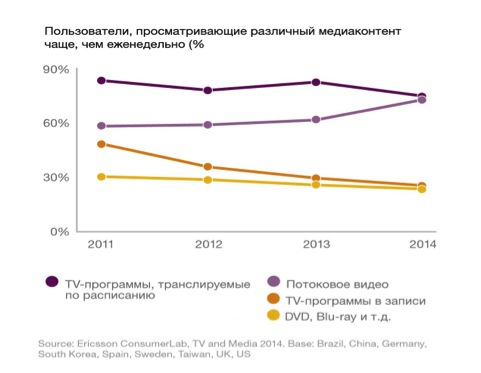 Еще одна тенденция, выделенная аналитиками Ericsson ConsumerLab и не упоминаемая разве что самыми ленивыми — это интерес к SVOD OTT-сервисам, дающим возможность смотреть передачи в записи по запросу, таким как Netflix и Hulu.