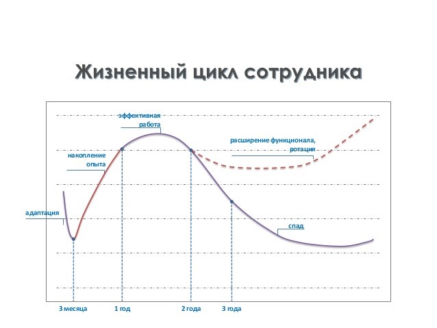 Как известно, у каждого сотрудника есть свой жизненный цикл эффективности в компании (см. Рис. 7). И на одном из последних этапов данного цикла ротация оказывается эффективной и действенной мерой продлений жизненного цикла сотрудника в организации, что уменьшает текучесть кадров в организации и помогает сохранить ценных сотрудников в обойме.