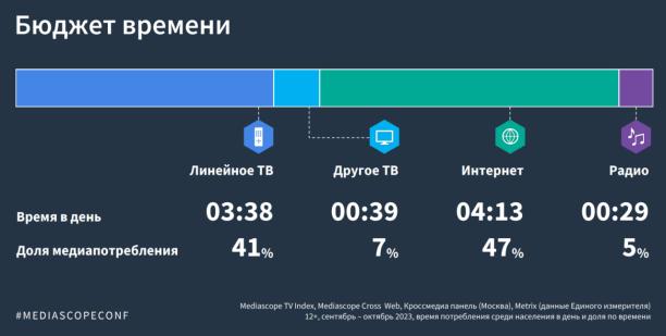 Для начала вспомним несколько статистических данных. Согласно аналитике Mediascope*, которая была представлена на собственной конференции компании, телесмотрение линейного ТВ равняется 3:38 мин. в день и составляет 41% от всего медиапотребления. На интернет же приходится 47% медиапотребления, а тратят на него россияне в среднем 4:13 мин. в день.