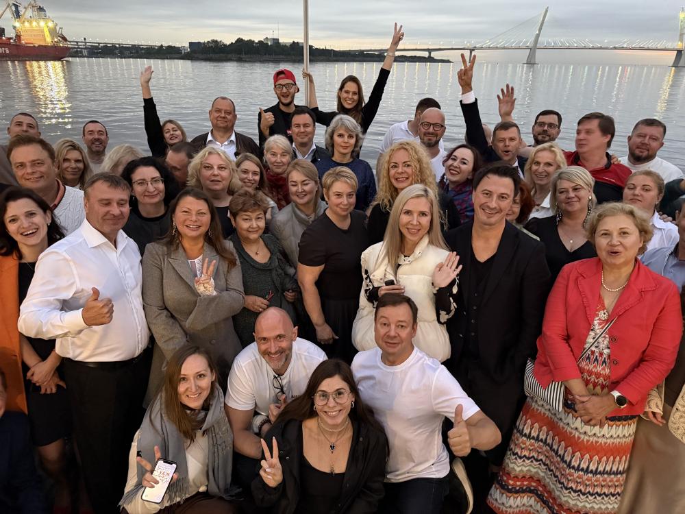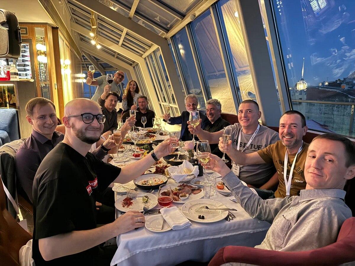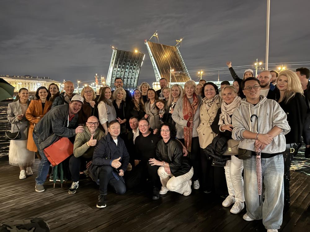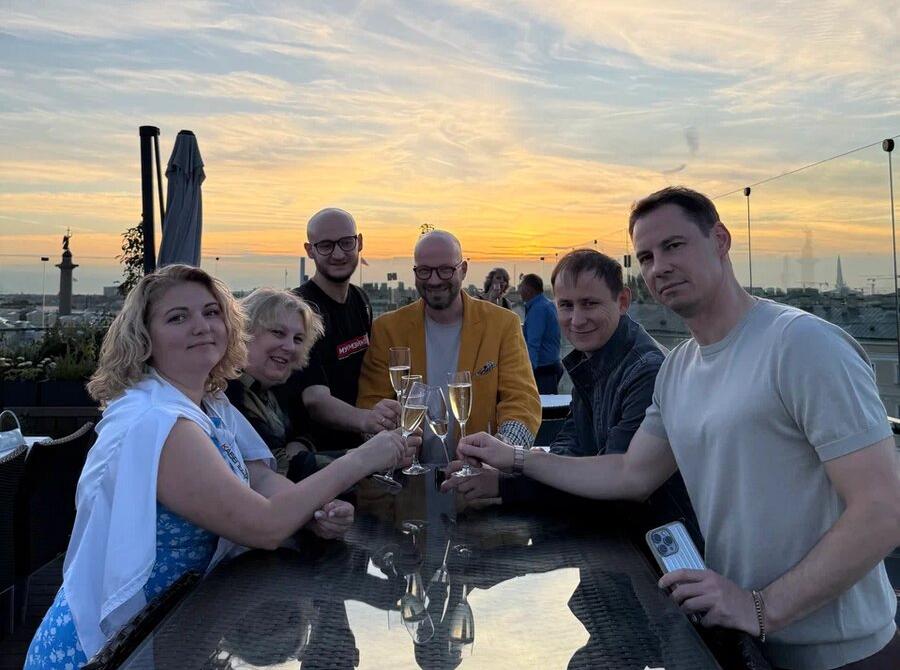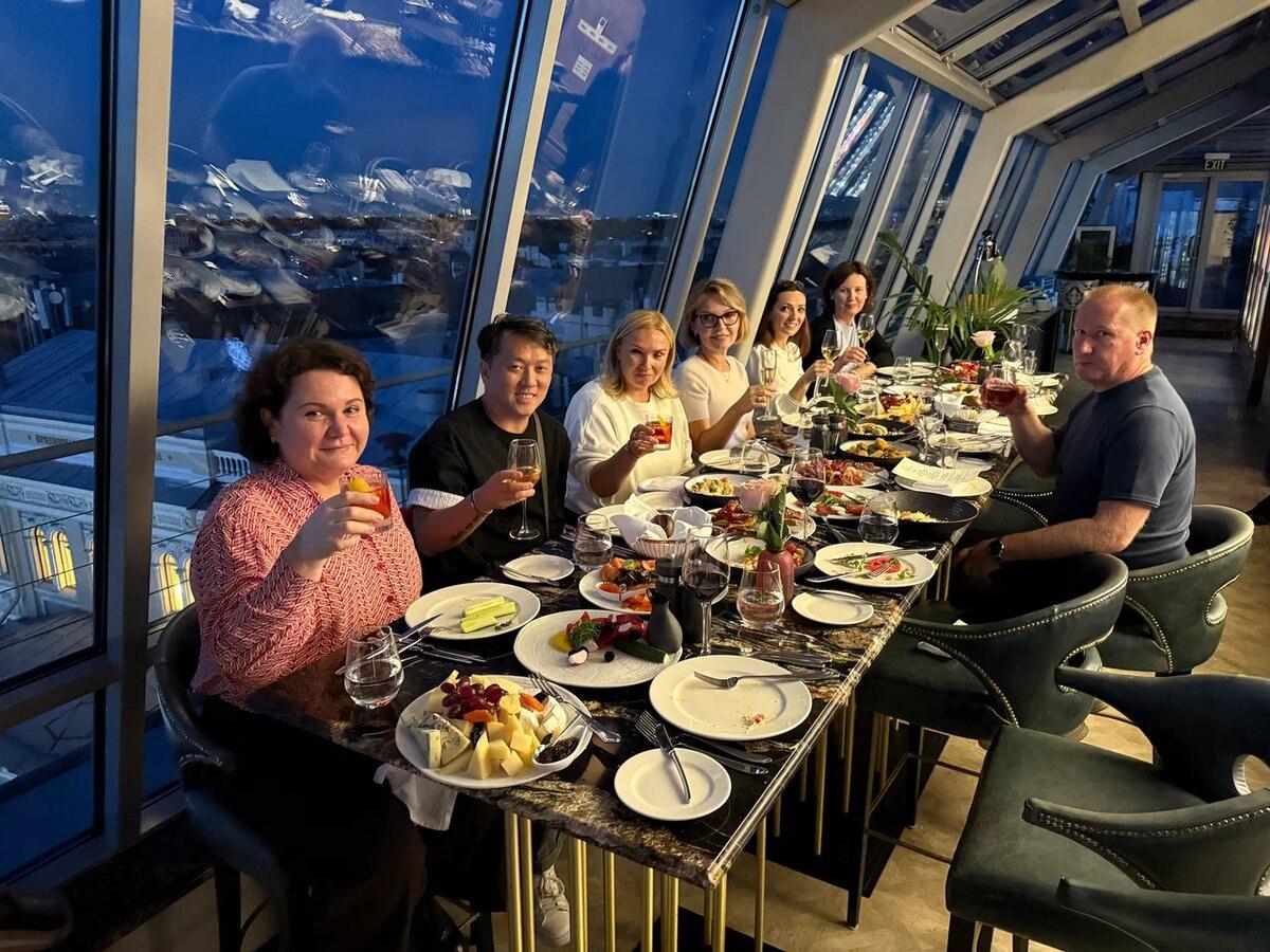 А после, насладившись видами исторических зданий и памятников во время прогулки по атмосферным улочкам центра, гости собрались на 9-этаже "Гранд отеля Мойка 22"в ресторане Bellevue, терраса которого буквально выходила на Дворцовую площадь перед Зимним дворцом.