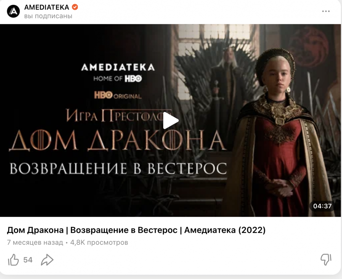 Успешное использование telegram ads с индивидуальным подходом к разным Telegram-каналам позволило привлечь новых подписчиков и увеличить охваты премьеры сериала "Дом Дракона". Также в июне онлайн-кинотеатр "Амедиатека" провел охватный конкурс во ВКонтакте, где провел розыгрыш постеров любимых проектов.