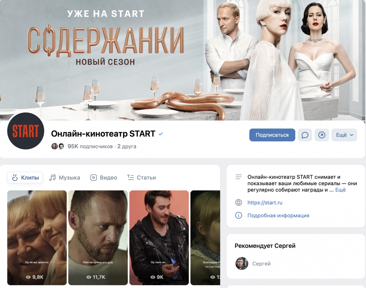 "Онлайн-кинотеатр Start представлен во всех социальных сетях с активной аудиторией: Telegram, YouTube, ВКонтакте, OK, Яндекс Дзен, TikTok, Twitter и на других площадках. На данный момент у нас есть аккаунты в 9 социальных сетях, над развитием которых мы активно работаем. В течение года мы наблюдали, что появлялись аналоги уже имеющимся социальным сетям, но ни одна из них не показала достаточного количества активных пользователей нужной нам ЦА.