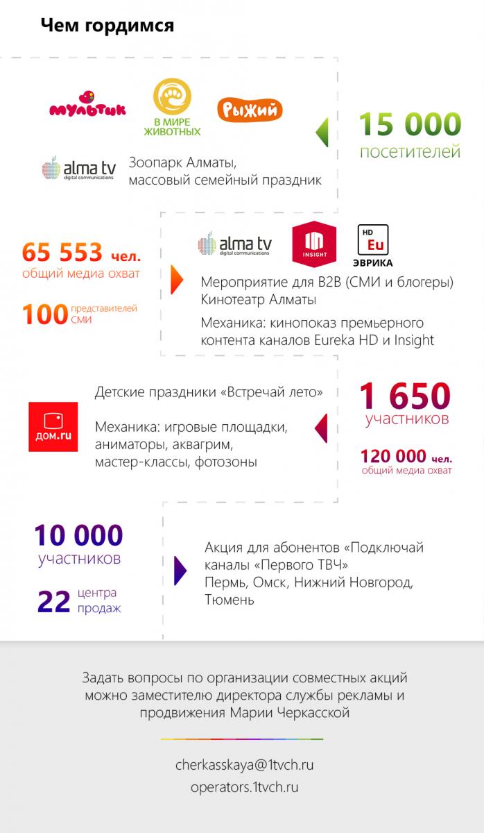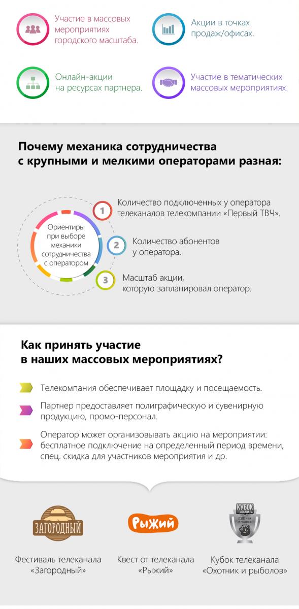 За последние годы "Первый ТВЧ" активно проводит мероприятия совместно с кабельными операторами, начиная с конкурсов в социальных сетях и распространения сувенирной продукции, и заканчивая проведением больших фестивалей. Маркетинговый подход компании помог получить максимальную отдачу от проведения акций: повысилась лояльность существующей аудитории телеканалов, заинтересованность потенциального зрителя, узнаваемость бренда среди телезрителей.