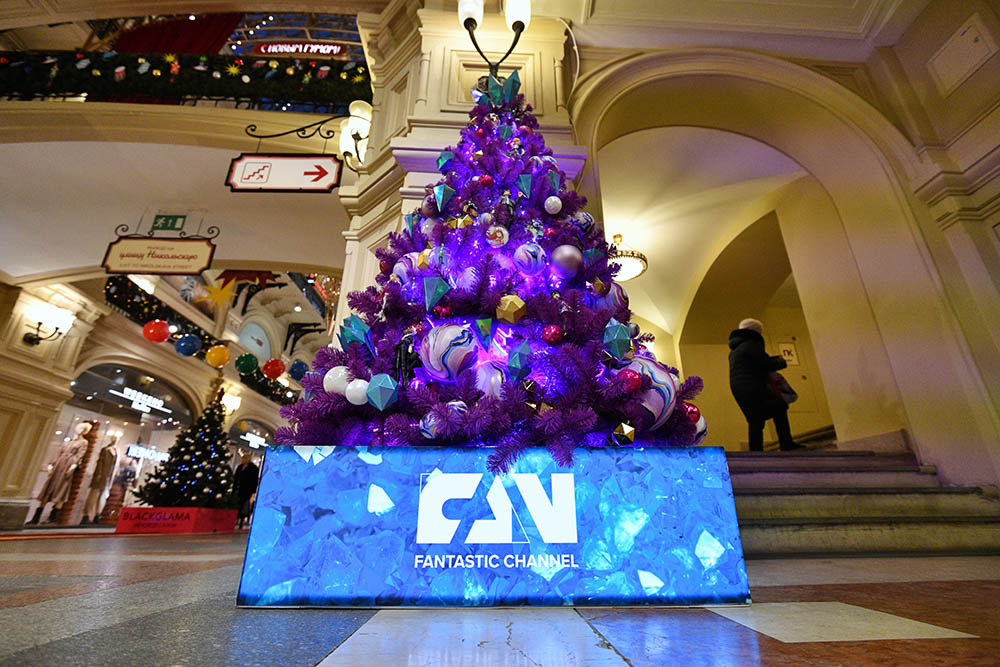 Дизайн ёлки FAN отражает направленность контента киноканала – аниме и фэнтези. Поэтому и цвет новогоднего дерева нестандартный – фиолетовый.