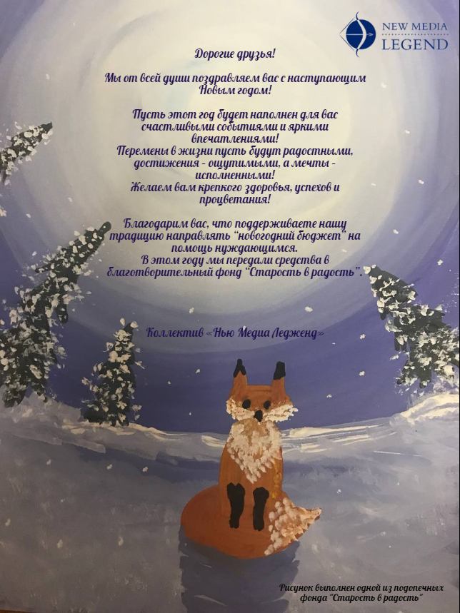 Компания New Media Legend также сделала новогоднюю рассылку партнерам, в ней открытка – поздравления с новым годом и новость – весь бюджет на подарки перечислен в Фонд "Старость в радость". Полезное дело!