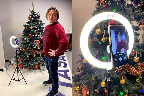 Компания Viasat дарила партнерам и коллегам наборы для самостоятельной съемки фото и видео. С ним селфи и видео получатся четкими и яркими независимо от освещения вокруг. Кольцевая лампа обеспечивает равномерное и яркое освещение и почти полное отсутствие теней в кадре. Набор включает штатив, лампу кольцевой подсветки с держателем для смартфона, фотоаппарата или видеокамеры, а также пульт управления, который позволяет дистанционно активировать камеру смартфона по Bluetooth. На лампе можно установить теплый, холодный или смешанный свет и выбрать уровень яркости.