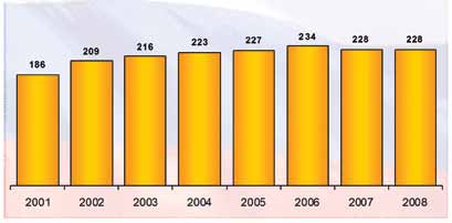 Видно, что основной прирост состоялся в 2001-2003 гг., когда в стране интенсивно строились национальные телесети. С 2004 г. – стабильность. Причем если раньше существовала большая разница в телесмотрении по федеральным округам (больше всего смотрели ТВ в Дальневосточном, а меньше всего – в Северо-Западном), то к 2008 г. разница почти нивелировалась.