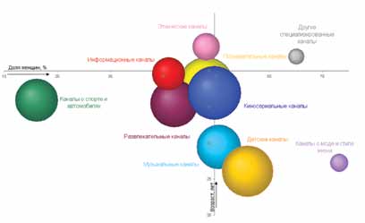 Размер кружка говорит о размере аудитории жанра. На пересечении осей пола и возраста находится «средний житель» страны. В России это скорее женщина около 40 лет. Положение познавательных и киносериальных каналов не говорит о том, что их продукт направлен только на «женщину 40 лет». Вероятнее, это результат того, что этих каналов больше всего, а ориентированы они на максимально широкую аудиторию – потому зрителей собирают больше других. Вообще же, самыми востребованными жанрами не только у нас в стране, но и во всем мире являются кино, сериалы, познавательные и развлекательные передачи. Новости на специализированных каналах зритель смотрит 11-12 минут в день, музыкальные каналы – 15-20. Зато у музыкальных каналов нет понятия «прайм-тайм». То есть он есть, но длится практически весь день, так как людей, включивших музыку на ТВ, примерно одинаковое количество в течение суток.