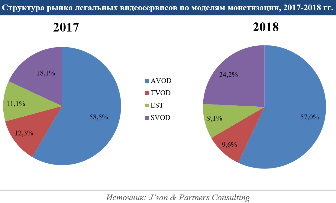 Как результат мы видим изменение структуры рынка по моделям заработка (см. диаграмму). Реклама пока остается доминантой, но подписка (SVOD) увеличила свою долю за год в 1,5 раза.