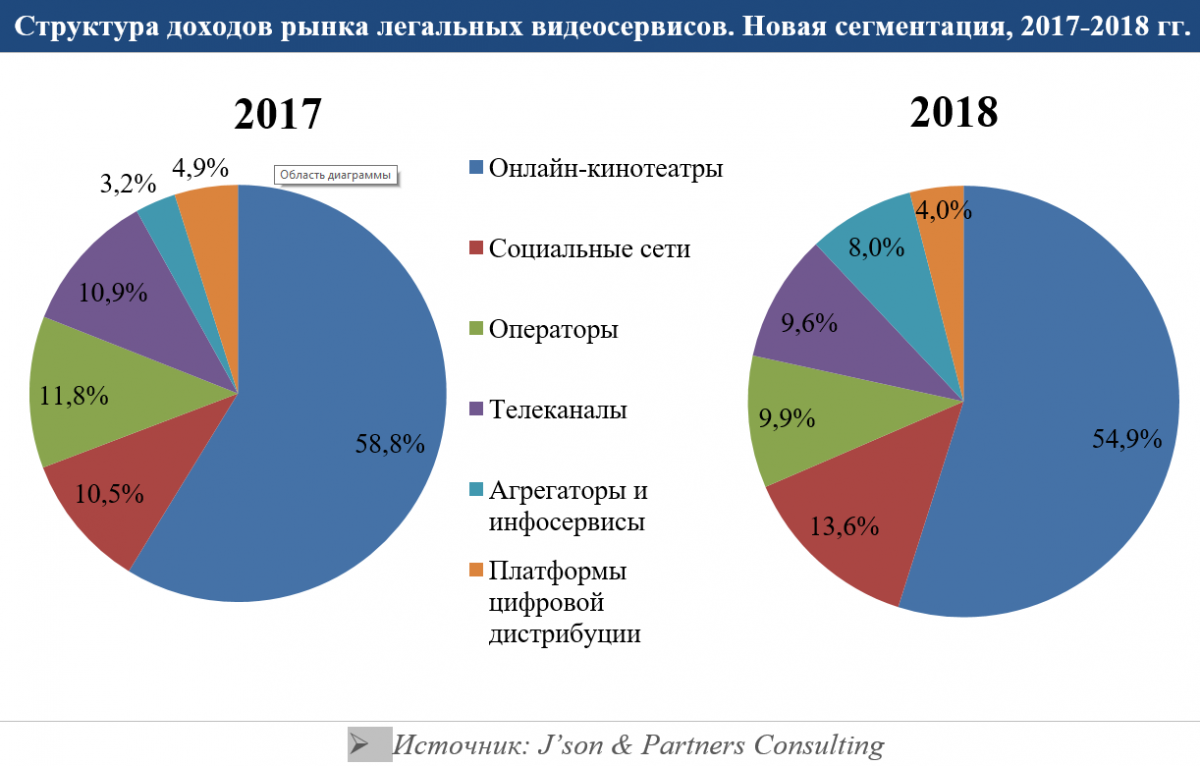 Понимая, что на рынке в 2018 году произошли глубинные изменения, J'son and Partners Consulting ввел в исследование новую сегментацию и расширил список анализируемых компаний с 49 до 68. Появились новые игроки (например, ТНТ-Премьер), а также мы стали учитывать тех, на кого раньше не обращали внимания ("мелочь", по российским понятиям, типа Netflix, Facebook или Instagram). Картина рынка теперь выглядит следующим образом: