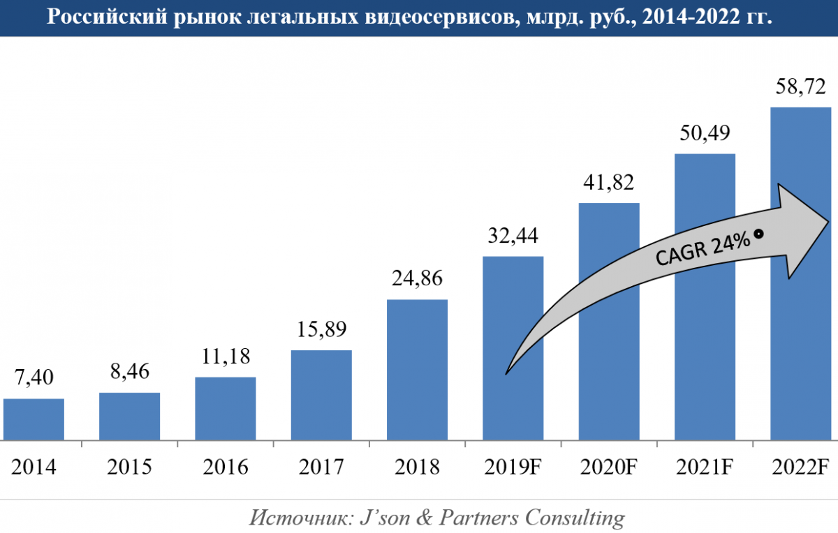 С учетом всех этих факторов J’son & Partners Consulting пересмотрел в сторону повышения взгляд на развитие рынка в ближайшей перспективе. В период 2019-2022 гг. темпы роста выручки увеличатся относительно предыдущего прогноза, CAGR составит 24%. Общие доходы от предоставления пользователям легального видео к 2022 году достигнут 58,7 млрд. рублей без НДС.