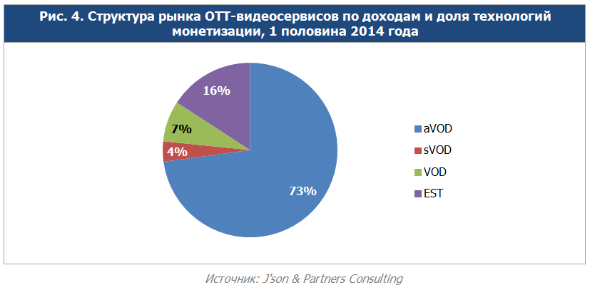 Прогнозов по распределению доходов от видов монетизации J'son не дает (по крайне мере, этих данных нет в кратком отчете компании), однако, на текущий момент большую часть выручки формирует реклама — 73%, а остальные 27% — различные платные модели: sVOD (подписка) — 4%, tVOD (плата за единицу контента) — 7% и EST (аренда, либо приобретение цифровой копии контента) — 16%.